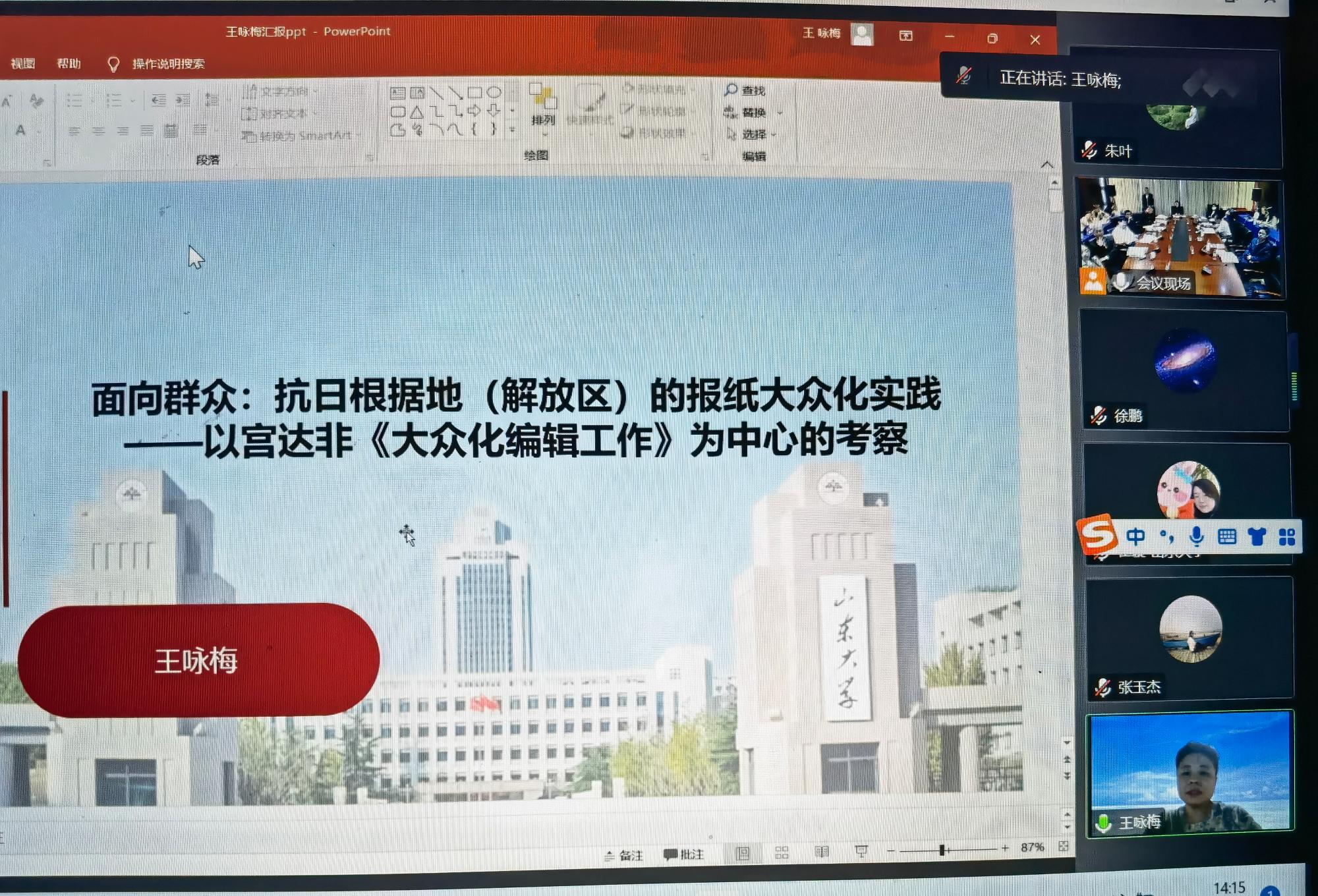 我院王咏梅教授应邀参加了本次会议,作了题为“面向群众:抗日根据地(解放区)的报纸大众化实践——以宫达非《大众化编辑工作》为中心的考察”的报告,详细介绍了在中国共产党领导的抗日根据地(解放区),办报工作在“面向群众、扎根群众”的道路上发展为具有独特观念及编辑方式的“报纸大众化”实践,凸显了党报宣传、联络和动员干部群众的作用。曾长期在山东抗日根据地(解放区)担任《泰山时报》《鲁中日报》《鲁中大众》《鲁中南报》主编的宫达非,从初期注重报纸内容、版面形式的通俗化,发展到同时推进工农通讯运动,树立了通俗化报纸的典范,撰写了影响广泛的《大众化编辑工作》。该书阐明了大众化编辑方法的理论基础、实质和具体的写稿、编辑原则,成为当时根据地(解放区)报纸学习的榜样。报纸大众化的编辑实践,表征了在革命动员和根据地文化建设的语境下,中共新闻工作坚持群众路线和“群众面向”的内在逻辑。