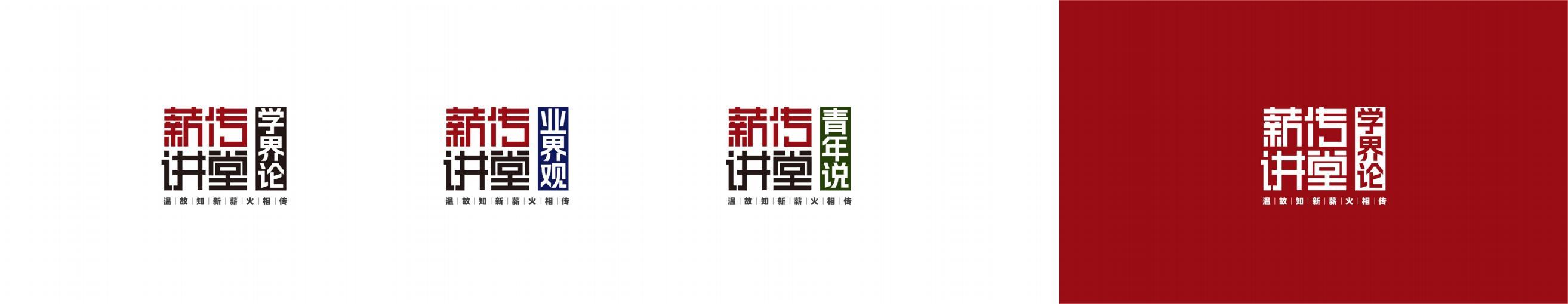 学术报告品牌主标识“薪传讲堂”以篆刻文字字形作为设计原点,体现标识的文化性;四字笔划处理成“横平与竖直”,是对传统文化中汉字书写要求的传承,也在一定意义体现“薪火相传”;“横平与竖直”的笔划处理更为简约,易识别,也更多充满现代化的设计特征;文字使用红黑两色,红色为山大红,是“斯文在兹”的形象阐释,与黑色搭配更为稳重。