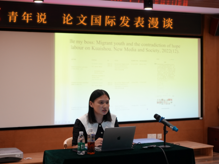 在讲座中,周敏基于自身博士论文选题与发表经历,分享博士研究从兴趣到研究,从写作到发表的宝贵经验。在论文选题上,她结合自身多次调整选题的经历强调学者除了专注学术研究,还应积极走出去,保持对社会动态的敏锐感知。在论文研究方法的选择上,她建议大家从自身兴趣出发,明确研究目标,寻找最适合的研究路径。在理论视角的选取上,她提倡从简单的套用理论转变为与理论进行深度对话,运用批判性思维去阅读和分析文献,做好详尽的文献笔记。在论文发表方面,周敏对期刊的选择和论文发表方向给出指导性建议。