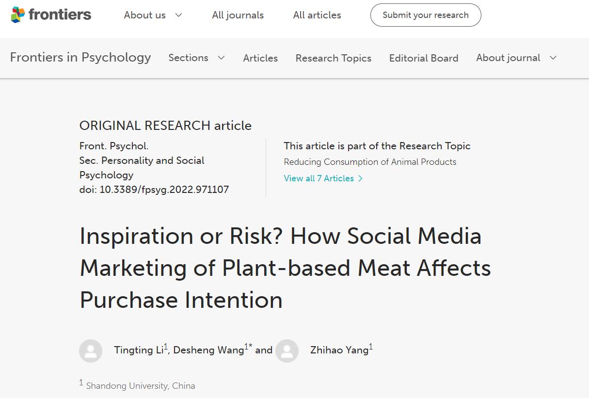 近日,我院王德胜教授作为通讯作者在SSCI收录期刊《Frontiers in Psychology》(JCR 1区期刊,2022年10月)发表论文《Inspiration or risk? How social media marketing of plant-based meat affects young people’s purchase intention》,william威廉中文为唯一通讯作者单位。《Frontiers in Psychology》是综合性的心理学领域专业学术期刊,创立于2010年,已被国际社会科学引文索引(Social Science Citation Index,SSCI)数据库正式收录,2022年影响因子(impact factor,IF)为2.99,论文总引用率排名第一,涵盖了几乎所有心理学领域的研究主题。