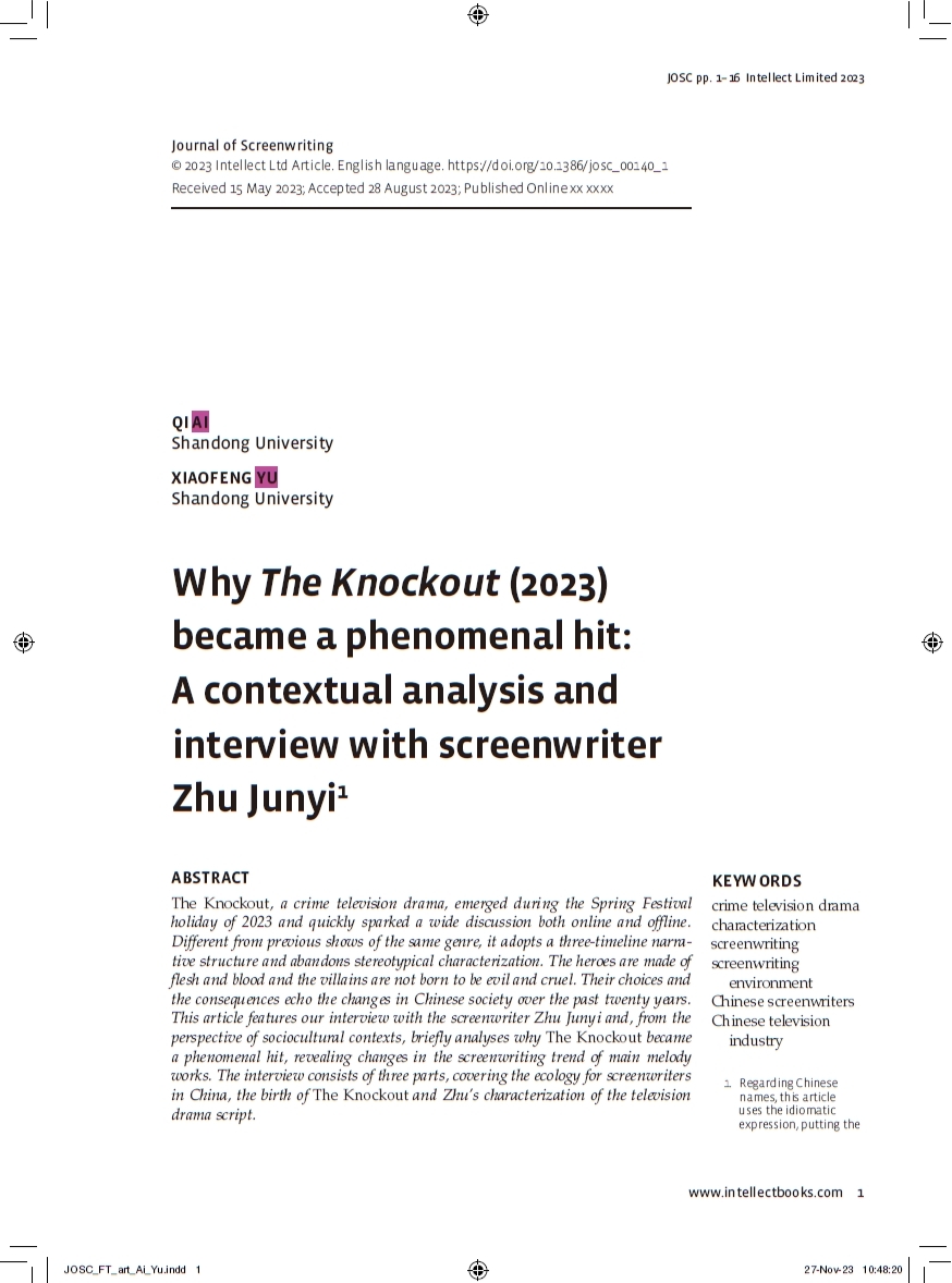 近日,威廉williamhill艾祺博士后和于晓风副教授在影视文化与传播现象级研究方面取得了新进展。相关研究成果以Why The Knockout (2023) Became a Phenomenal Hit: a Contextual Analysis and Interview with the Screenwriter Zhu Junyi”为题,被A&HCI期刊《Journal of Screenwriting》(JCR Film Radio and Television领域1区影响因子0.2,JCR Literature 领域1区影响因子0.2,SJR分区1区,影响因子0.15)录用。艾祺博士后为该论文第一作者,于晓风副教授为该论文通讯作者,william威廉中文为第一作者单位。