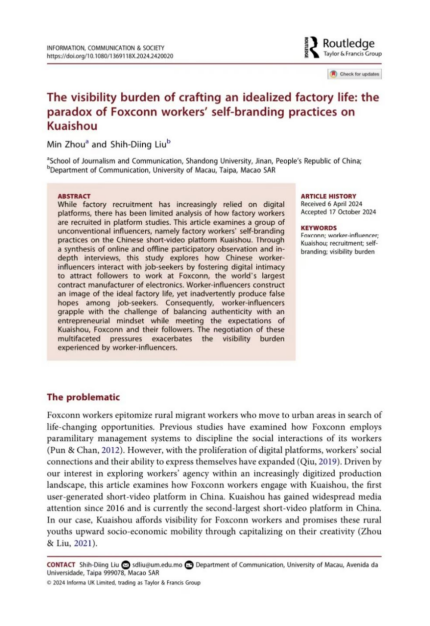 近日,我院周敏副研究员SSCI期刊《Information, Communication and Society》发表论文《The visibility burden of crafting an idealized factory life: the paradox of Foxconn workers’ self-branding practices on Kuaishou》,该论文系周敏主持的山东省自然科学基金资助项目“数字乡村建设过程中的行政负担与基层负担研究”的阶段性研究成果。《Information, Communication and Society》2024年影响因子4.2,JCR 传播学领域区期刊。该刊汇集了有关新兴信息和通信技术新兴特性对社会、经济和文化影响的最新研究成果,探讨与信息和通信技术的发展和应用相关的各种问题。