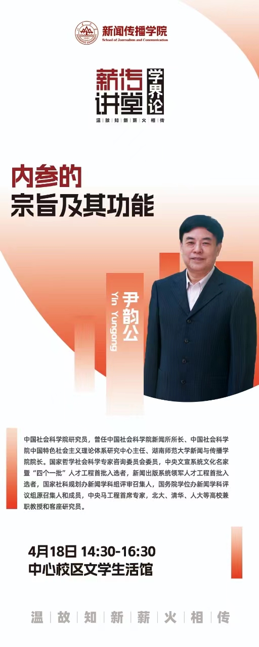 尹韵公研究员,曾任中国社会科学院新闻所所长、中国社会科学院中国特色社会主义理论体系研究中心主任、湖南师范大学新闻与传播学院院长。国家哲学社会科学专家咨询委员会委员,中央文宣系统文化名家暨“四个一批”人才工程首批入选者,新闻出版系统领军人才工程首批入选者,国家社科规划办新闻学科组评审召集人,国务院学位办新闻学科评议组原召集人和成员,中央马工程首席专家,北大、清华、人大等高校兼职教授和客座研究员。