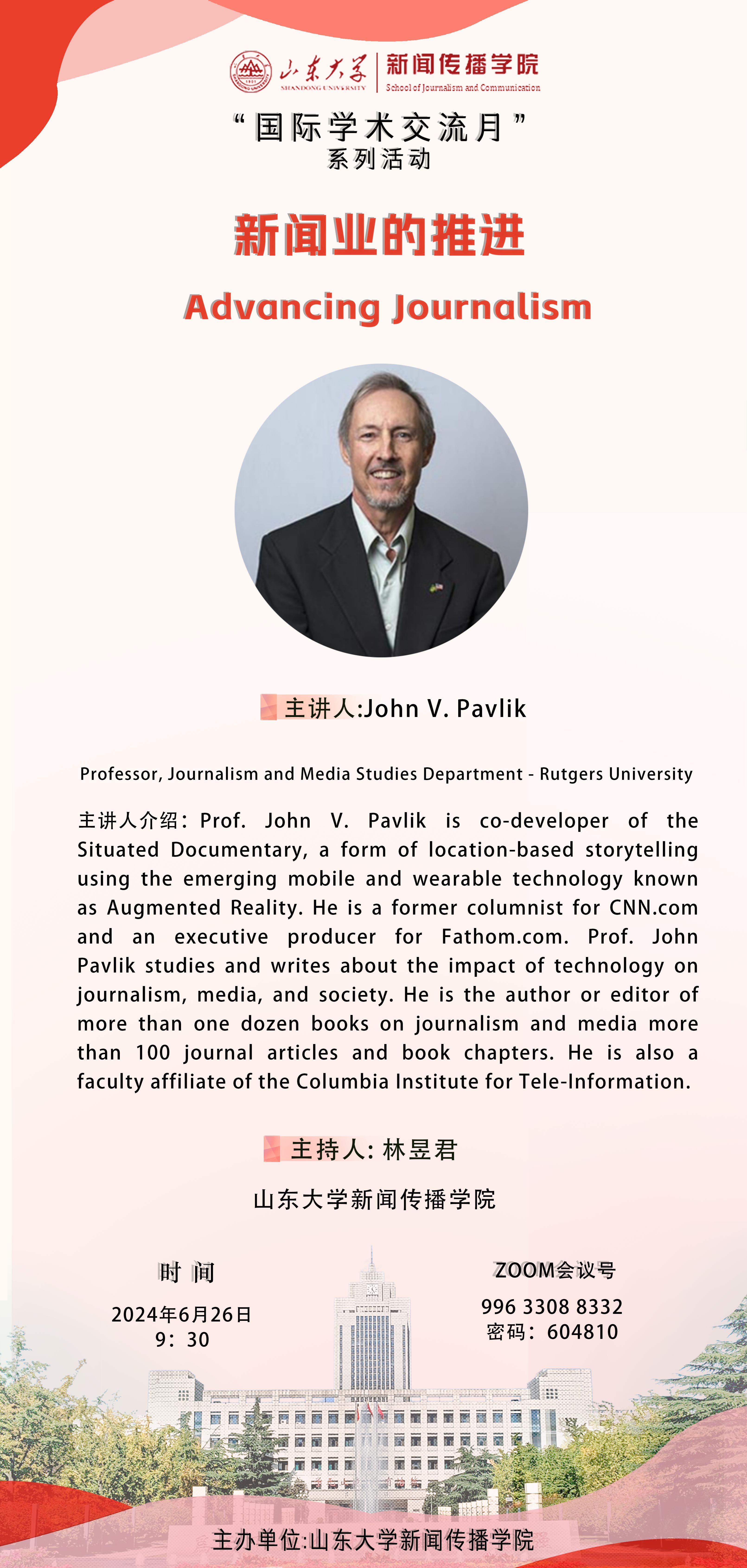 六、主讲人简介:Prof. John V. Pavlik is co-developer of the Situated Documentary, a form of location-based storytelling using the emerging mobile and wearable technology known as Augmented Reality. He is a former columnist for CNN.com and an executive producer for Fathom.com. Prof. John Pavlik studies and writes about the impact of technology on journalism, media, and society. He is the author or editor of more than one dozen books on journalism and media more than 100 journal articles and book chapters. He is also a faculty affiliate of the Columbia Institute for Tele-Information.