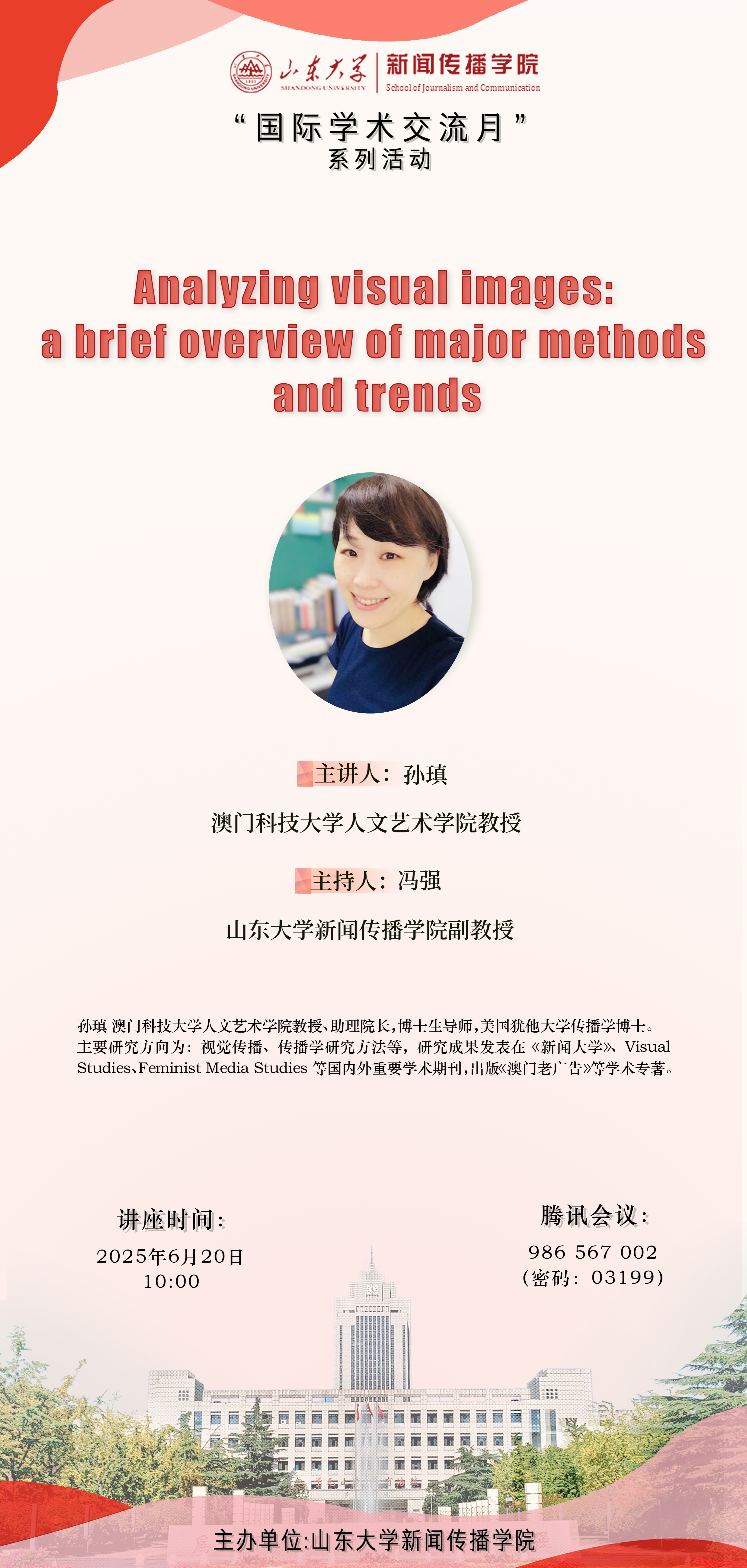 孙瑱 澳门科技大学人文艺术学院教授、助理院长,博士生导师,美国犹他大学传播学博士。主要研究方向为:视觉传播、传播学研究方法等,研究成果发表在《新闻大学》、Visual Studies、Feminist Media Studies等国内外重要学术期刊,出版《澳门老广告》等学术专著。