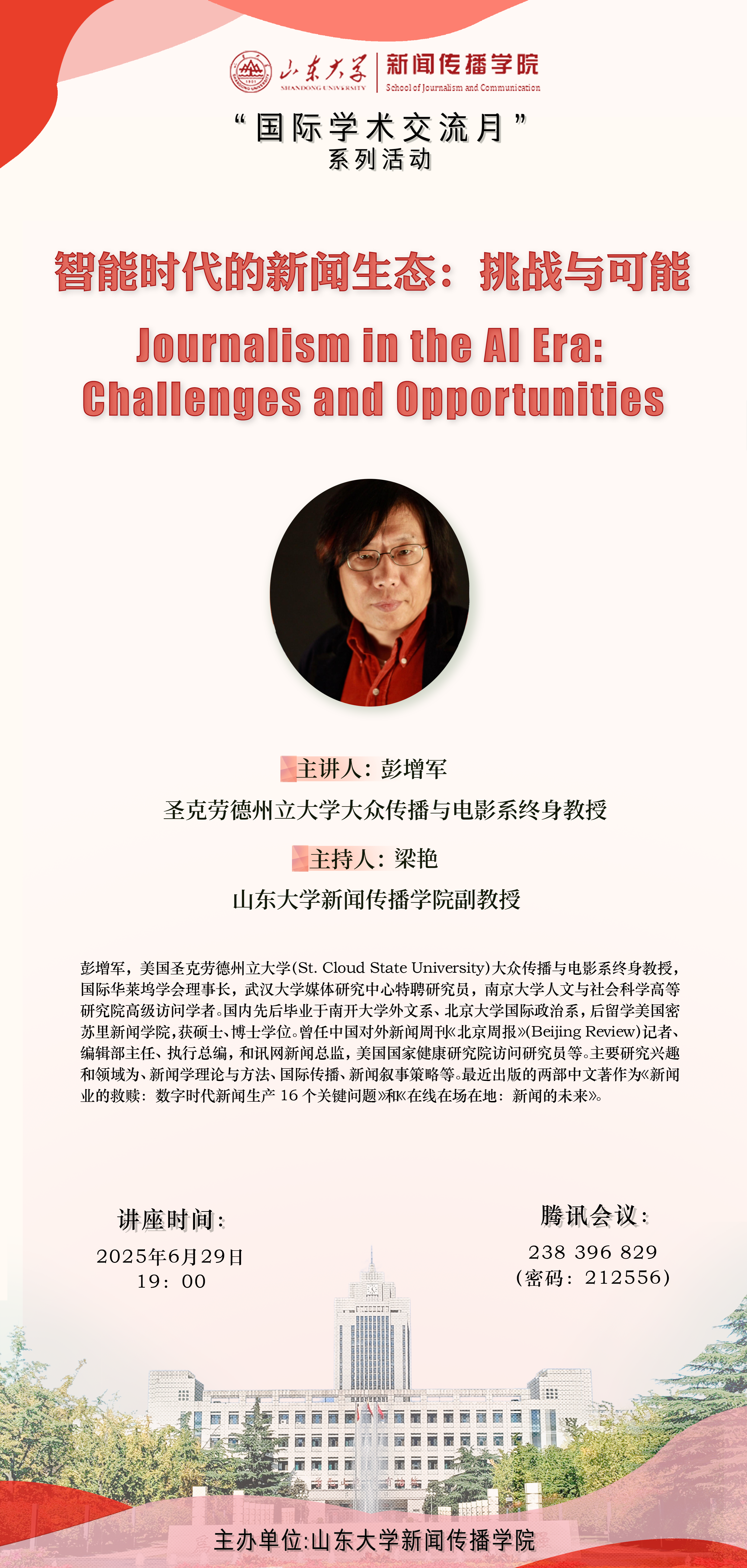 一、讲座题目:Journalism in the AI Era: Challenges and Opportunities(智能时代的新闻生态:挑战与可能)