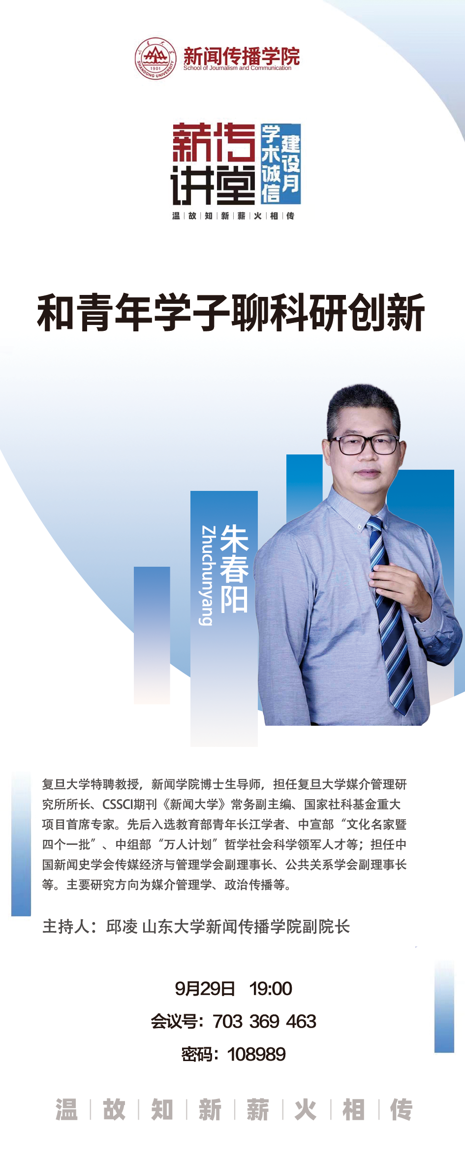 朱春阳,复旦大学特聘教授,新闻学院博士生导师,担任复旦大学媒介管理研究所所长、CSSCI期刊《新闻大学》常务副主编、国家社科基金重大项目首席专家。先后入选教育部青年长江学者、中宣部“文化名家暨四个一批”、中组部“万人计划”哲学社会科学领军人才等;担任中国新闻史学会传媒经济与管理学会副理事长、公共关系学会副理事长等。主要研究方向为媒介管理学、政治传播等。