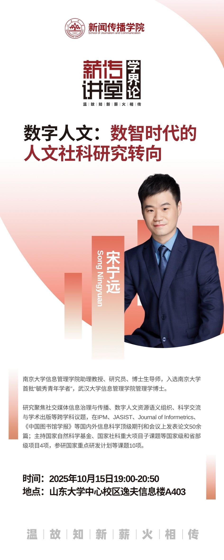 宋宁远,南京大学信息管理学院助理教授、研究员、博士生导师,入选南京大学首批“毓秀青年学者”,武汉大学信息管理学院管理学博士。研究聚焦社交媒体信息治理与传播、数字人文资源语义组织、科学交流与学术出版等跨学科议题,在IPM、JASIST、Journal of Informetrics、《中国图书馆学报》等国内外信息科学顶级期刊和会议上发表论文50余篇;主持国家自然科学基金、国家社科重大项目子课题等国家级和省部级项目4项,参研国家重点研发计划等课题10项。