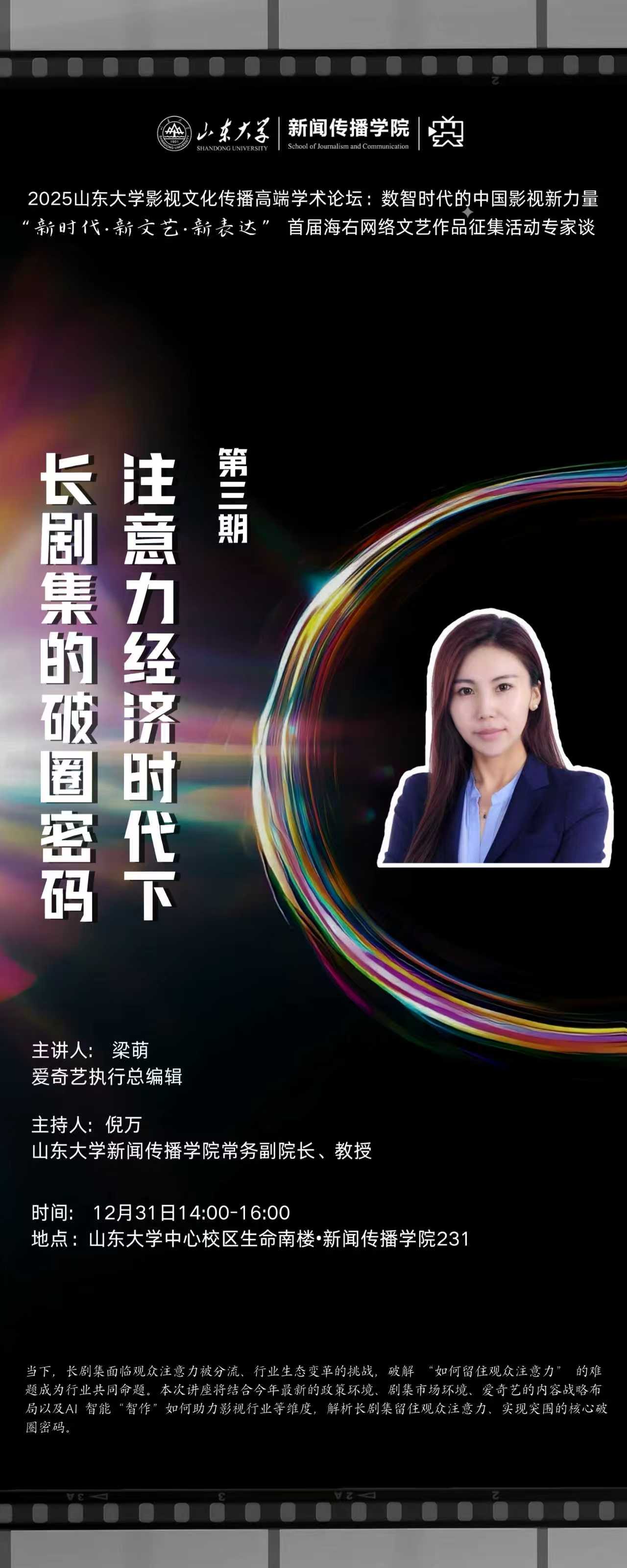 六、主讲人简介:梁萌,作为爱奇艺执行总编辑,中华广播影视交流协会理事,北京网信办人才库领军人才,负责爱奇艺全平台剧集、电影等专业内容的规划编审工作,担任平台影视内容编审,全面加强平台内容的规划和管理,从节目政策研究、播出规划到内容编审,专业化、全流程管理平台头部自制剧集、电影。规划编审爱奇艺重点剧场“迷雾剧场”“恋恋剧场”“小逗剧场”“微尘剧场”,以及重点项目《生万物》《我的阿勒泰》《狂飙》《风吹半夏》《人世间》等,荣获“飞天奖”“金鹰奖”“白玉兰奖”等专业领域最高奖项,以节目编审保障播出安全,推动精品创作,切实把好平台内容的导向关和品质关。