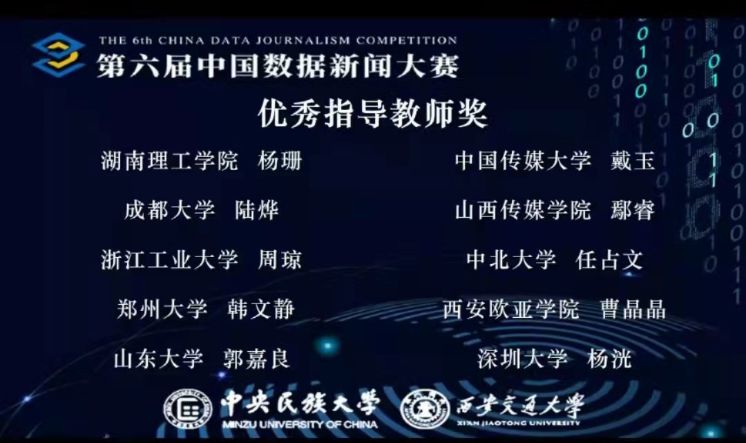 11月6日第六届中国数据新闻大赛决赛落下帷幕,我院2018级本科生牛凝、杨婷丹、汪龙佳团队参赛作品《这届老年人当起网红,也太强了吧!》获得三等奖、研究生陆炫羽团队作品《现实版“小舍得”:小学生家长为何最焦虑?》获得优秀奖、新媒体系教师侯滢和实验室助教郭嘉良分别获得优秀指导教师奖。