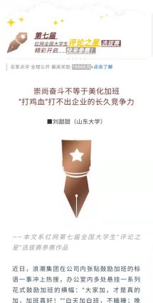 刘甜甜同学凭借文字评论作品《崇尚奋斗不等于美化加班,打鸡血打不出长久竞争力脱颖而出从劳动法角度深入剖析了某企业要求员工“一年加班600多个小时”的行为,指出这显然罔顾了员工的身体健康、个人利益,并进一步点明只有关注员工切身利益的企业才能走得更稳更远,斩获文字评论组第名,根据大赛规则,红网授予刘甜甜月度之星称号。