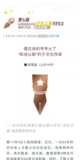 欧慧晶同学作品《唱古诗的爷爷火了,“和诗以歌”利于文化传承》分析了对诗歌加以配唱,以“乐语教国子”的行为,对诗词文化的传播与传承有着重要意义。呼吁文化工作者继续打磨和钻研“和诗以歌”的传承方式,发扬诗词文化,促进传统优秀文化的创造性转化、创新性发展。