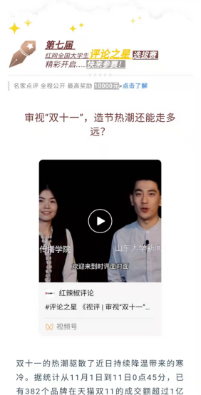 曲亚宁、李谡、敖宇和吕昕纯同学凭借视频评论作品《审视双十一,造节热潮还能走多远?成功突围,其借助视频的新形式,对双十一造节热潮带来的“流量见顶效应”进行反思,指出造节本身无可厚非,但是过度造节则会适得其反,既脱离了理性购物的实质,又偏离了满足消费者的目标,警惕每一个“造节者”均应冷静思考狂热的购物潮背后难以为继的购物隐患,斩获视频评论组第二名,根据大赛规则,红网授予曲亚宁等“月度之星·视评奖”荣誉证书。