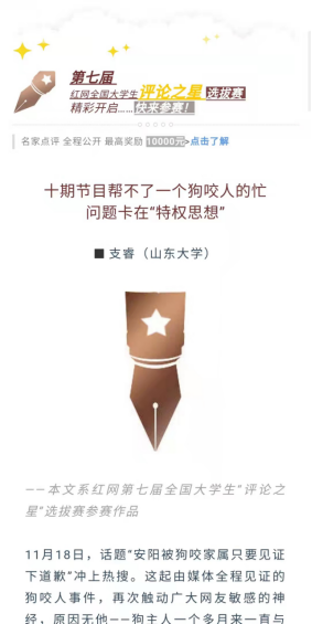 支睿同学作品《十期节目帮不了一个狗咬人的忙,问题卡在“特权思想”》通过难以解决的“狗咬人”事件切入,反思公职人员违法违规却依然理直气壮的文化心理根源——“官本位”思想,指出此事的教训不应只停留在对该公职人员的追责上,更要让一些仍有“特权思想”的公职人员趁早熄了这个念头,俯下身子扎扎实实干工作。