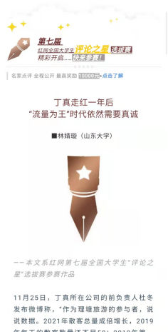 林婧璇同学作品《丁真走红一年后,“流量为王”时代依然需要真诚》指出丁真固然是打开理塘的一扇窗,但如果不是这扇窗背后有如此多感人至深的故事,人们也不会在这扇窗前驻足停留。在“流量为王”的时代,娱乐至上不再是争夺流量的天然法则,深耕文化内涵,挖掘背后的故事或许才是网友们内心真正想看见的。