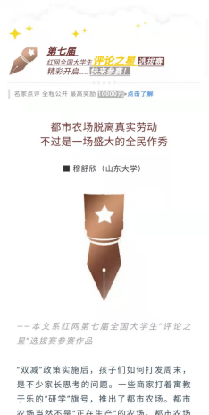 穆舒欣同学作品《都市农场脱离真实劳动,不过是一场盛大的全民作秀》批判目前绝大多数都市农场的发展已经与最初的许诺背道而驰,所谓“寓教于乐”的研学之旅,也只是披上“劳动教育”外壳的单纯娱乐活动。唯有让孩子投入到真正的农耕劳动中去学习知识,才能实现都市农场的教育意义。
