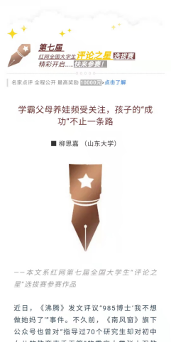 柳思嘉同学作品《学霸父母养娃频受关注,孩子的“成功”不止一条路》反思人们对高学历父母养娃关注的深层次原因,认为孩子的教育是一条漫长的征途,没有人会取得捷径,高学历父母的成功或许无法完全复制,但子女通往成功的道路却不止一条。