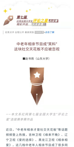 赵书雨同学作品《中老年相亲节目成“笑料”,这块社交天花板不应被忽视》从中老年相亲节目火爆的社会现象入手,指出“老年人谈恋爱”这件事不应该仅作为搞笑视频出现在人们的视野里,随着我国老龄化程度的不断加深,社会各界均应关注该群体的情感诉求,并帮助他们更好地运用互联网表达自我需求,让爱情不因黄昏而止。