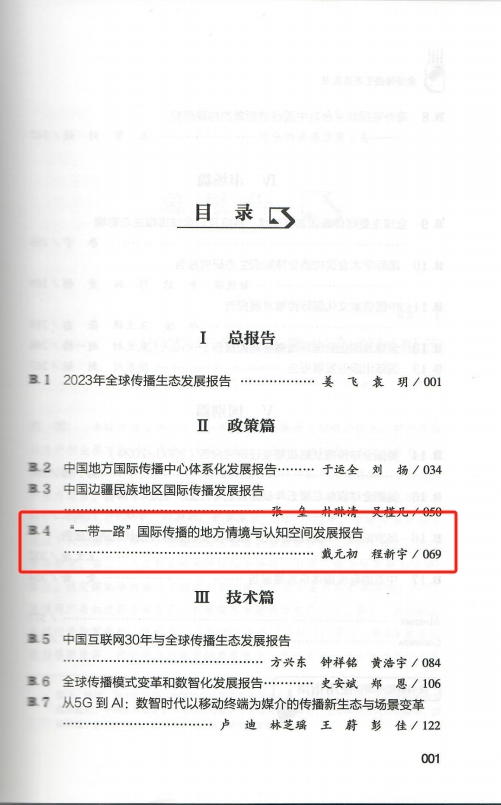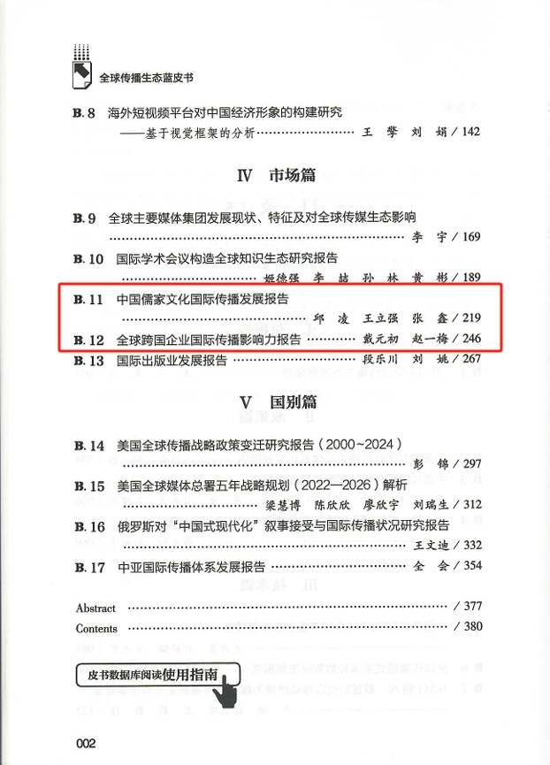 邱凌团队撰写的《中国儒家文化国际传播发展报告》收录于报告市场篇,报告通过梳理全球三大主流社交媒体平台中儒家文化的国际传播现状,探讨儒家文化在新媒体时代国际传播的传播状况和传播效果,并以此为基础,管窥中华文化国际传播更高效能的实践路径。戴元初教授团队撰写的《“一带一路”国际传播的地方情境与认知空间发展报告》收录于报告政策篇,通过对选取的全球10国进行问卷调查,探讨了“一带一路”倡议传播行为的地方情境效应与认知空间结构;《全球跨国企业国际传播影响力报告》收录于报告市场篇,报告将全球跨国企业视为新时代国际传播行为体,对2024年全球跨国企业国际传播影响力进行评估,以网络影响力、全球企业互动、公众关注、全球营商能力为评估指标体系主要维度,观照其对中国国际传播影响力提升的贡献度与现存问题。