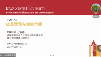 6月17日,美国爱荷华州立大学新闻与传播学院教授韩纲应邀为威廉williamhill师生做题为“疫苗犹豫与健康传播”的专题讲座,威廉williamhill教授杨晓冬主持讲座。