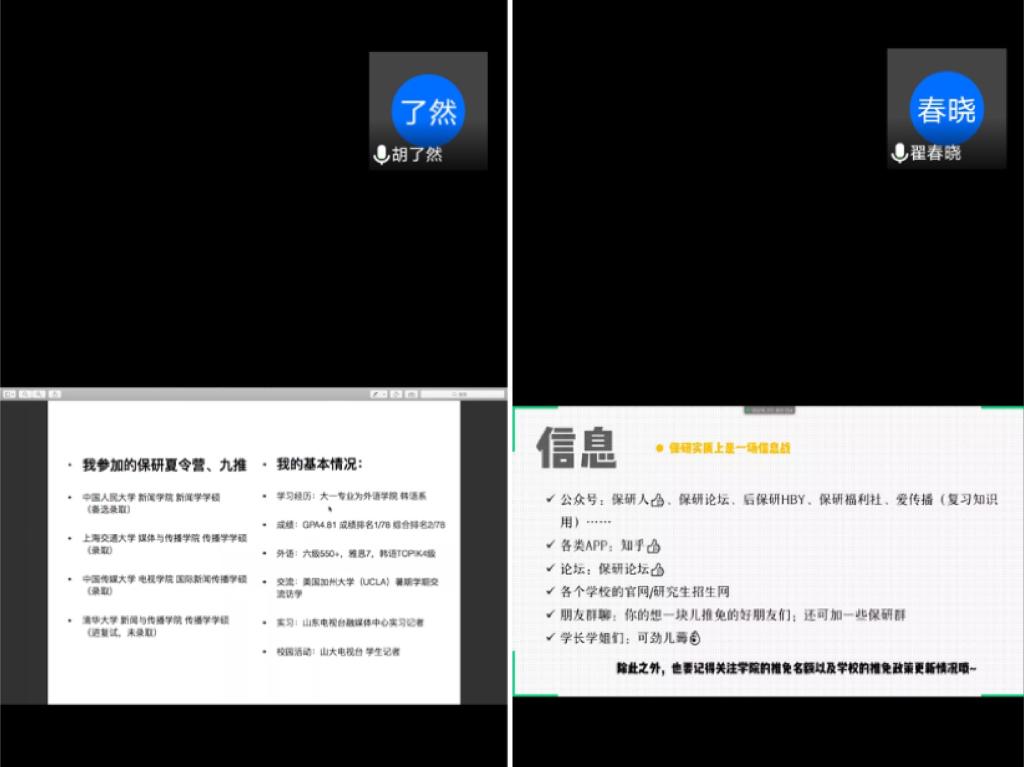 对于保研,翟春晓则从定位、信息和心态三个角度出发,分享作为保研边缘生的推免心得,告诉学弟学妹当前阶段应该如何取舍、作何准备。在定位上,翟春晓以自己为例,告诉学弟学妹提前全方位了解自己,并介绍“保底、求稳、冲刺”的目标确定方法。在信息角度,翟春晓介绍了信息搜集渠道和文书与夏令营的准备,并分享参加厦大、中传夏令营的经历。最后,翟春晓在心态上给学弟学妹加油鼓劲,叮嘱学弟学妹们尽快确立目标,做好规划。