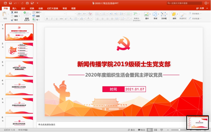 接下来,支部成员开展批评与自我批评环节,每位党员按照座次顺序依次进行批评与自我批评,剖析问题,深刻反思。刘帆指出,希望大家能在今后的学习工作中反思不足,认真总结,在实践过程中做出改变,更好地发挥学生党员的先锋模范作用。然后,支部进行2020年度民主评议党员活动。党员大会根据民主测评情况,综合党员日常表现等情况,实事求是地对支部党员进行评议。