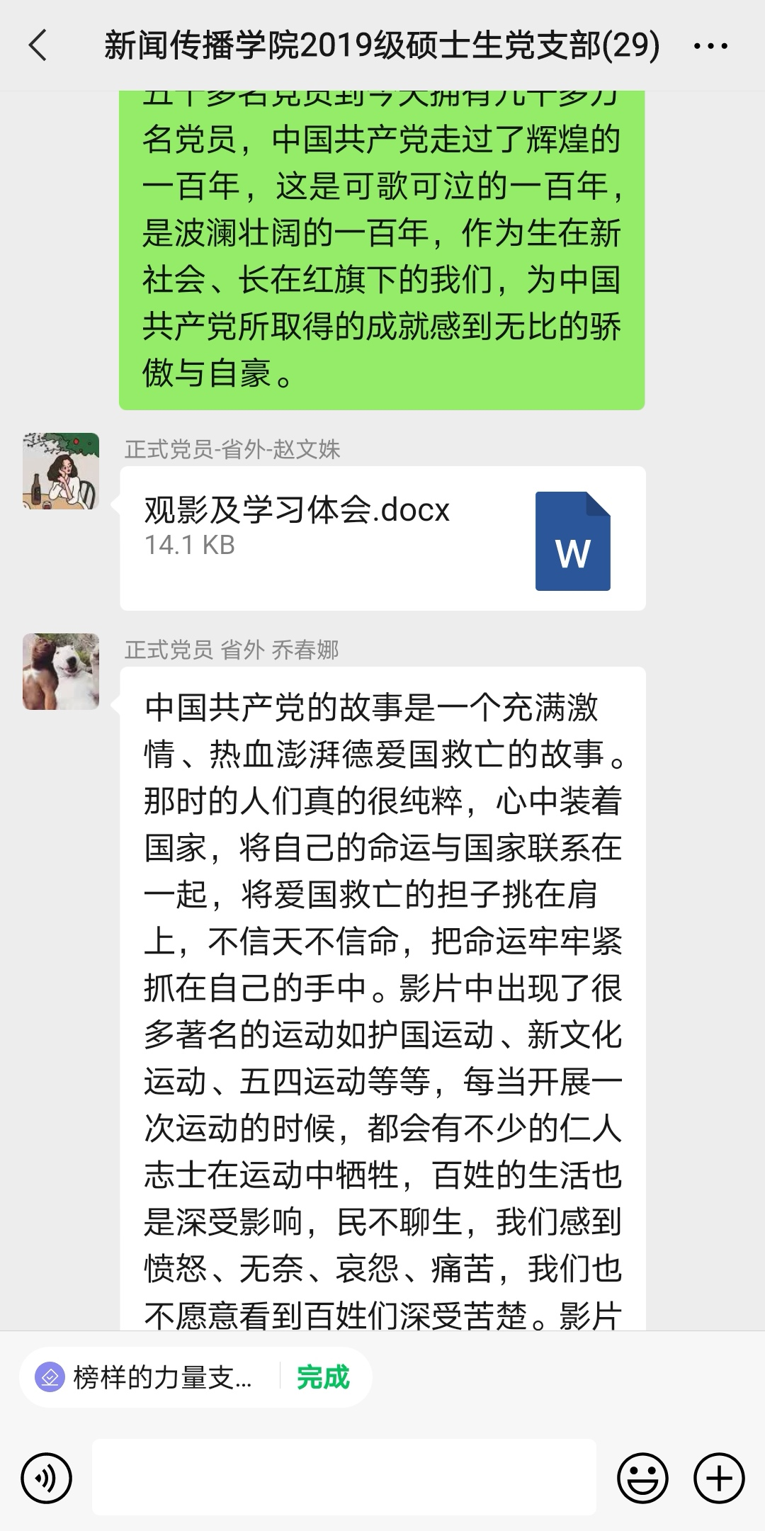 本次观影主题活动,以“观影+分享”的形式开展,党支部全体成员自行观看影片《建党伟业》,并于清明节当天在微信群进行观影感悟分享。《建党伟业》围绕1921年前后展开,展现了1911年辛亥革命后到1921年中国共产党成立这段时光内的历史故事与风云人物,它以毛泽东、李大钊、陈独秀、蔡和森、周恩来等一批中国共产党员为中心,讲述了他们在风雨摇摆的时代为国家赴汤蹈火的精彩故事。这是一个青春、激情、奋斗、献身的故事。在那一代年轻人的身上,担负着救亡图存、改写历史的大任。正是这批年轻人,用他们的青春与热血,描绘出了新生的中国,谱写了一曲瑰伟壮丽的礼貌之歌。我们今天的一切,都与他们当年的奋斗和发奋息息相关,他们与我们,昨日和今天,血肉相连。作为新一代的年轻人,作为学生党员,我们更有义务与职责,将共产主义事业进行下去,为祖国的明天而奋斗。