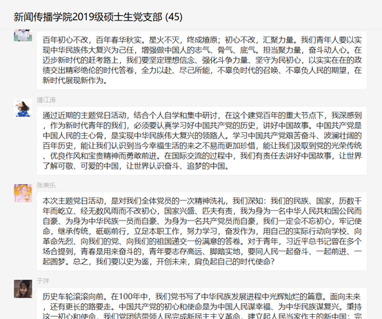 随后支部成员共同温习了习近平总书记“七一”重要讲话精神,并在会上进行了热烈的讨论。朱可可同学谈到:历史和人民选择了中国共产党,党历经100年的风雨路程,带领中国人民开启新生活,进入新时代。身为中国人民,我感受到中国共产党的领导力,身为中共党员,我感受到中国共产党为人民服务的决心。打江山,守江山是为人民。习近平总书记的话如雷贯耳,作为一名学生党员,我要时刻牢记党的教导,不断奋斗,不忘初心。