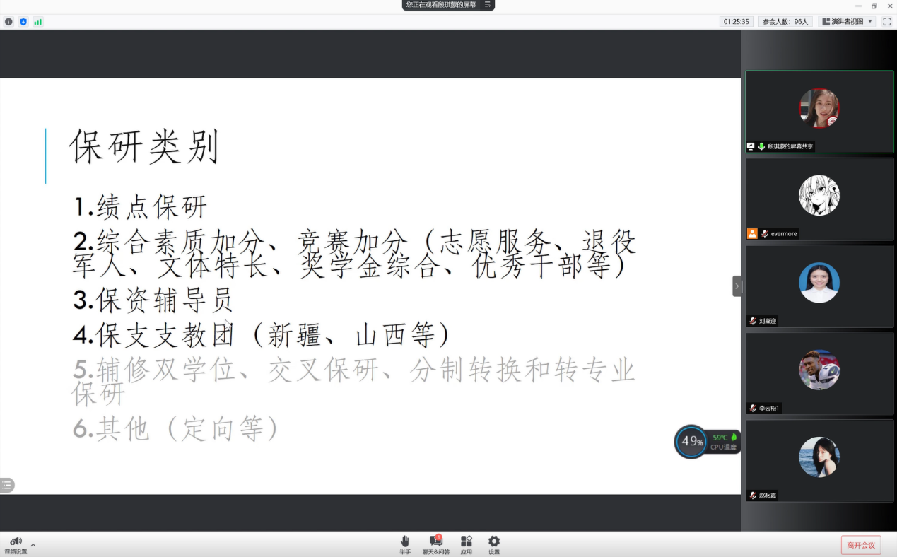 殷琪蒙重点介绍了保研类别和今年的保研政策,梳理了保研流程,最后分年级向各位同学给出了详尽的保研导向建议。她通过自己的保研经历总结出了绩点保研、综合素质加分、保资辅导员、保资支教团等六种保研类别,从6月夏令营到9月预推免的详细保研流程,加深了同学们对于保研的了解。接下来她从保研流程、院校选择、考核方式、软实力拓展和心态调节等方面分年级给出了建议;大一尽情尝试、大二厚积薄发、大三冲刺。最后,她告诉同学们考研与保研没有优劣,读研与工作没有优劣,要保持一个健康的心态,学会调节自己的心理状态。