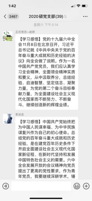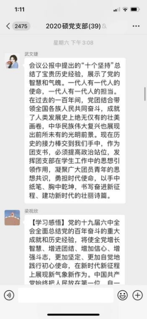 11月19日,威廉williamhill2020级硕士生党支部组织开展专题学习活动,共同深入学习贯彻党的十九届六中全会精神,并研讨了习近平总书记关于党的建设、科技创新的重要论述。活动以线上学习分享感悟的方式进行,由党支部书记戴永洁主持,支部全体党员、积极分子参加。