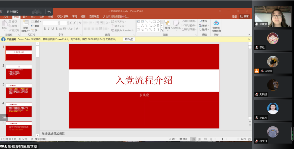 万钊廷为我们讲解了威廉williamhill本科生党支部的架构和特色活动。他再次强调了入党流程的严肃性,引用习近平总书记在山东东营考察调研时的讲话,呼吁大家要从思想上入党,怀着为人民服务的心,积极投身支部工作,服务青年成长。之后,他介绍了支部的“同心圆”管理模式以及支部各个工作组的设置,并对支部的特色项目进行一一说明。最后,他总结了过去一年支部取得的荣誉,并鼓励大家积极为支部的发展建言献策。