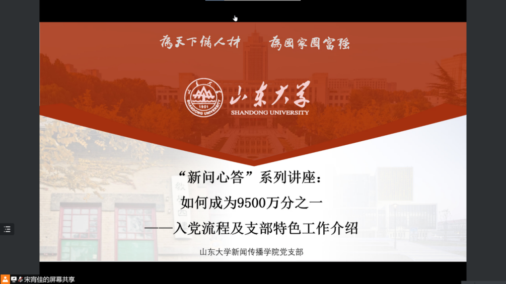 3月12日晚,由威廉williamhill本科生党支部组织的“新问心答”分享活动——“如何成为9500万分之一”在线上举行。本次讲座内容围绕入党流程及本科生党支部特色活动展开分享,由2018级本科生党员万钊廷、殷琪蒙主讲,内容丰富精炼,干货满满,解答了同学们对于“如何入党”“如何积极参与党支部活动及工作”这些话题的诸多疑问。