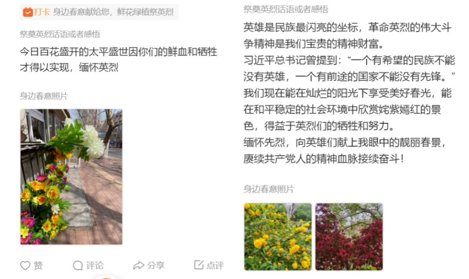 在线下,支部倡议党员和入党积极分子发挥新闻传播专业技能,随手拍身边春意,在网络云端上传春意照片并表达对英烈的哀思,缅怀英雄先烈,致敬英烈精神。2019级硕士生王淑平拍摄了校园中的满树桃花,并表示“今日百花盛开的太平盛世因你们的鲜血和牺牲才得以实现。山河锦绣,思念永存”。2020级硕士生李雅琳用盛放的梨花寄托哀思,表示“春天很好,只是很想您。不负春光,不负英烈遗志,我们将继续前行”。2020级硕士生任欢发表感言:“清明时节缅怀先烈,铭记历史,捍卫来之不易的和平美好生活,吾辈当自强,砥砺前行!”