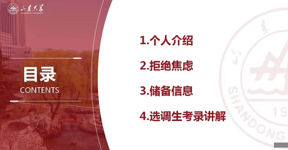 姜珊以克服焦虑为引,从个人介绍、拒绝焦虑、储备信息、选调生考录讲解四个方面进行了分享,她以自己在毕业季的择业就业经历为例,告诉大家在选择的过程中要把握好心态、锁定好目标,然后在各渠道中搜寻充足的信息,以此保持不盲目乐观的心理状态,明确好自己在就业潮中的定位。