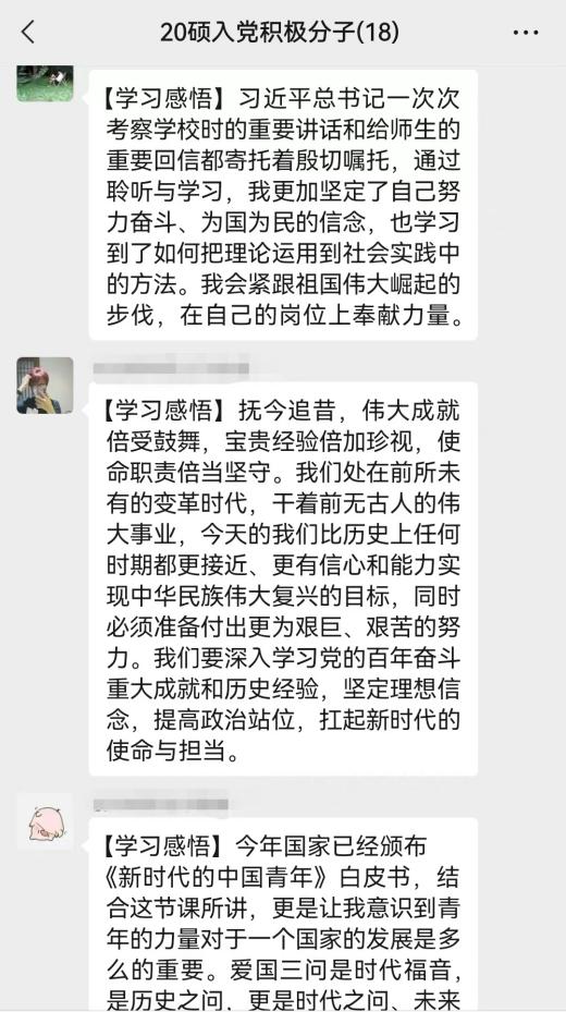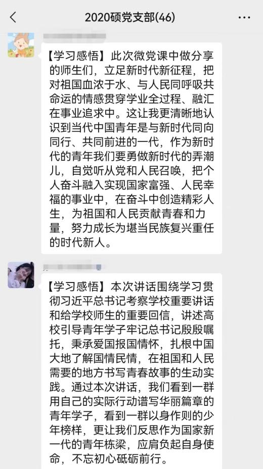 观看完微党课,支部成员们进行了广泛交流与讨论。党员戴永洁提到,在聆听了南开大学的爱国三问、报国情怀,西安电子科技大学的红色基因传承精神及“西藏大学”、“宜宾学院”微党课辅导后,更加深刻认识到,青年已成为祖国发展的中流砥柱,新时代青年要将个人梦与中国梦结合起来,不断用社会主义核心价值观涵养言行品格,不断提升专业技能和社会实践水平。党员章佳琪表示,“从小我做起,为大我担当,能感动别人,也能教育自己。”作为新时代的青年人,在实现中华民族伟大复兴的新征途上要牢记嘱托,勤勉实践,以实际行动回答好新时代的“爱国三问”,努力在青春赛道上跑出最好成绩。入党积极分子张俊语谈到,习近平总书记一次次考察学校时的重要讲话和给师生的重要回信都寄托着殷切嘱托,让自己更加坚定了勇毅担当、为国为民的信念,也学习到了如何把理论运用到社会实践中的方法,自己会紧跟祖国伟大崛起的步伐,在自己的岗位上奉献力量。