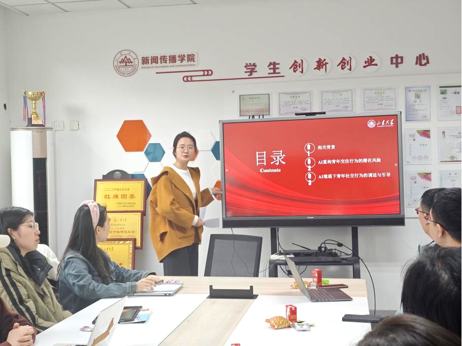 接下来,匡丽君同志以“AI重构青年交往行为的影响与调适”为主题进行分享。在数字化浪潮之下,生成式人工智能正改变我们的生活,在其构设青年社会交往新型基础设施和实践逻辑中可能存在类人陪伴与现实交往的阻抑,内容失真与交往道德遮蔽,资本布控与西方价值观输出等潜在风险。这一观点让同学们认识到在利用AI的同时要保持独立的思考判断,警惕虚拟交往对真实世界的代替,坚守正确的世界观、人生观、价值观。